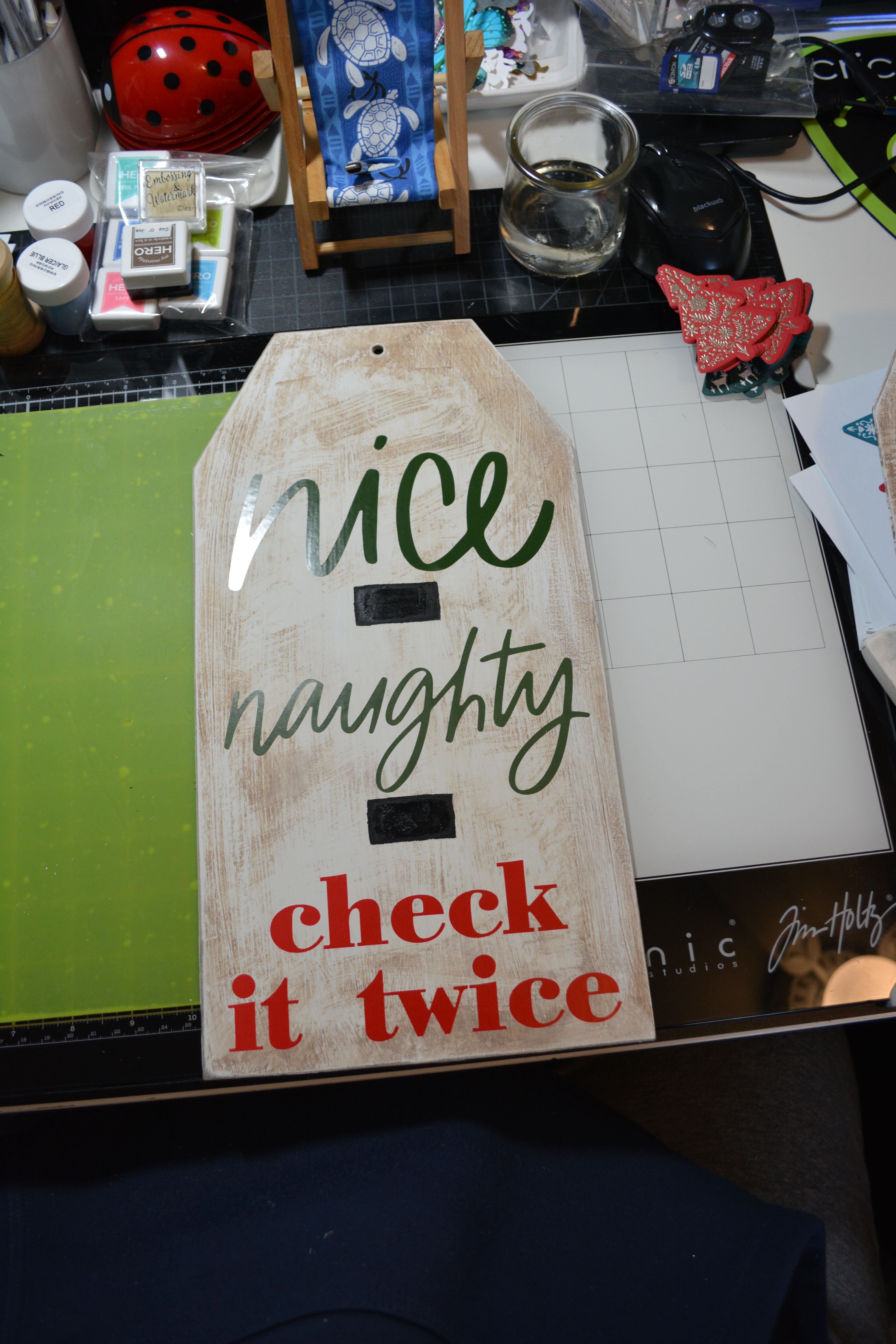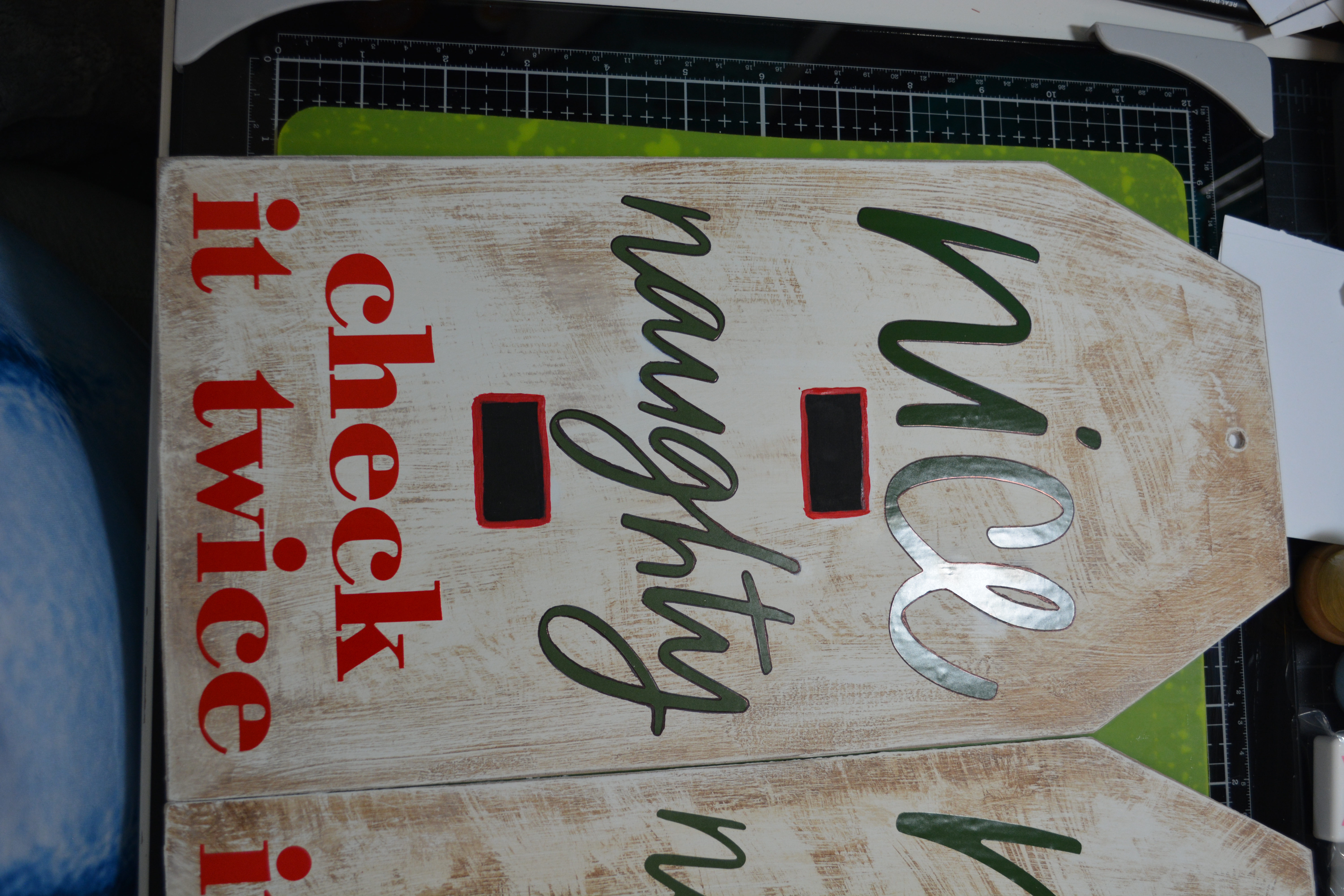 To put the decal on, I used the same method with the contact paper as I did before. I did do it word by word though except the “check it twice” I put all three words on the contact paper at the same time and applied them to the tag.