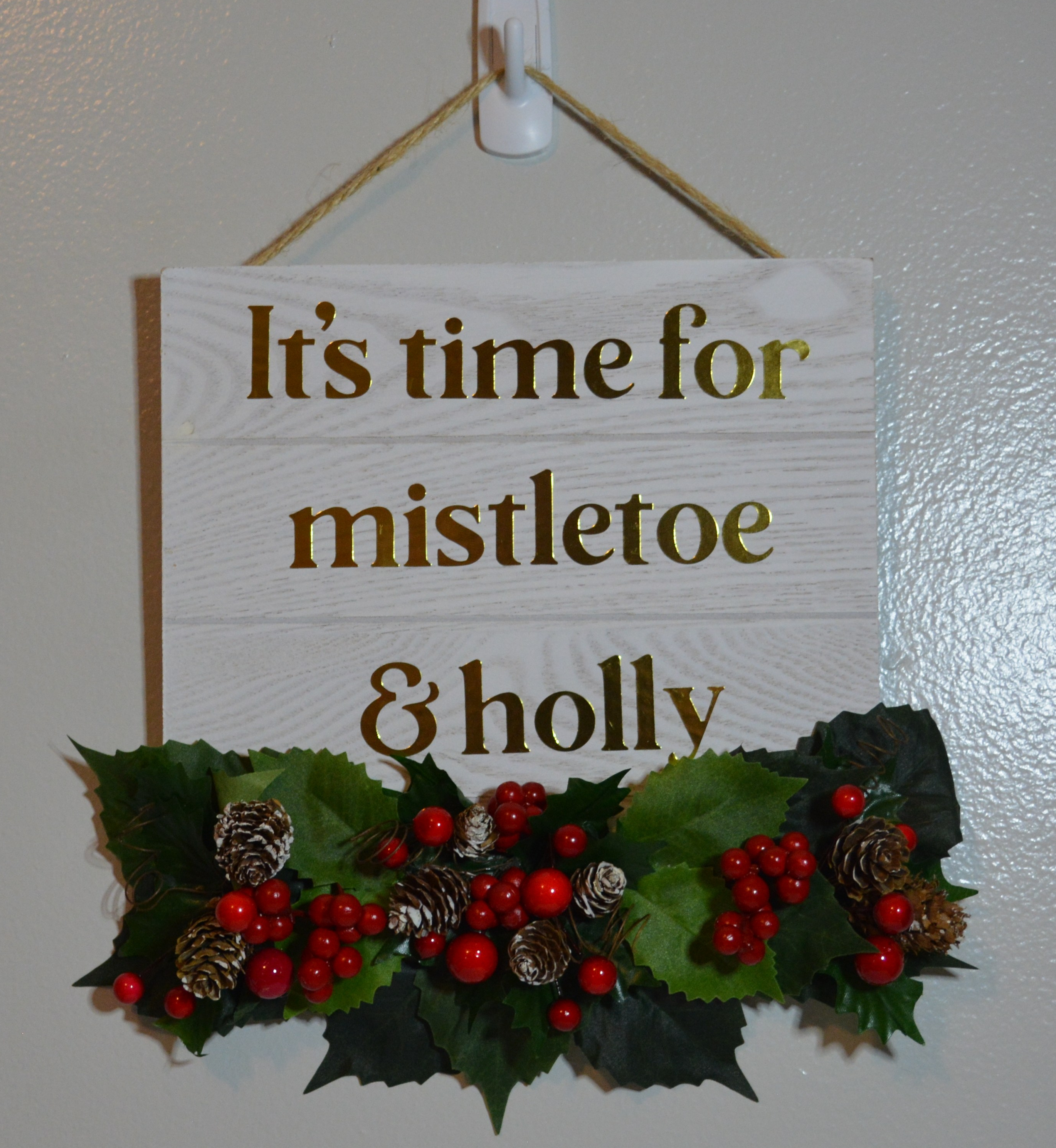 Next glue the flowers or holly around where you want it on the sign. I put mine at the bottom, but do what you like.