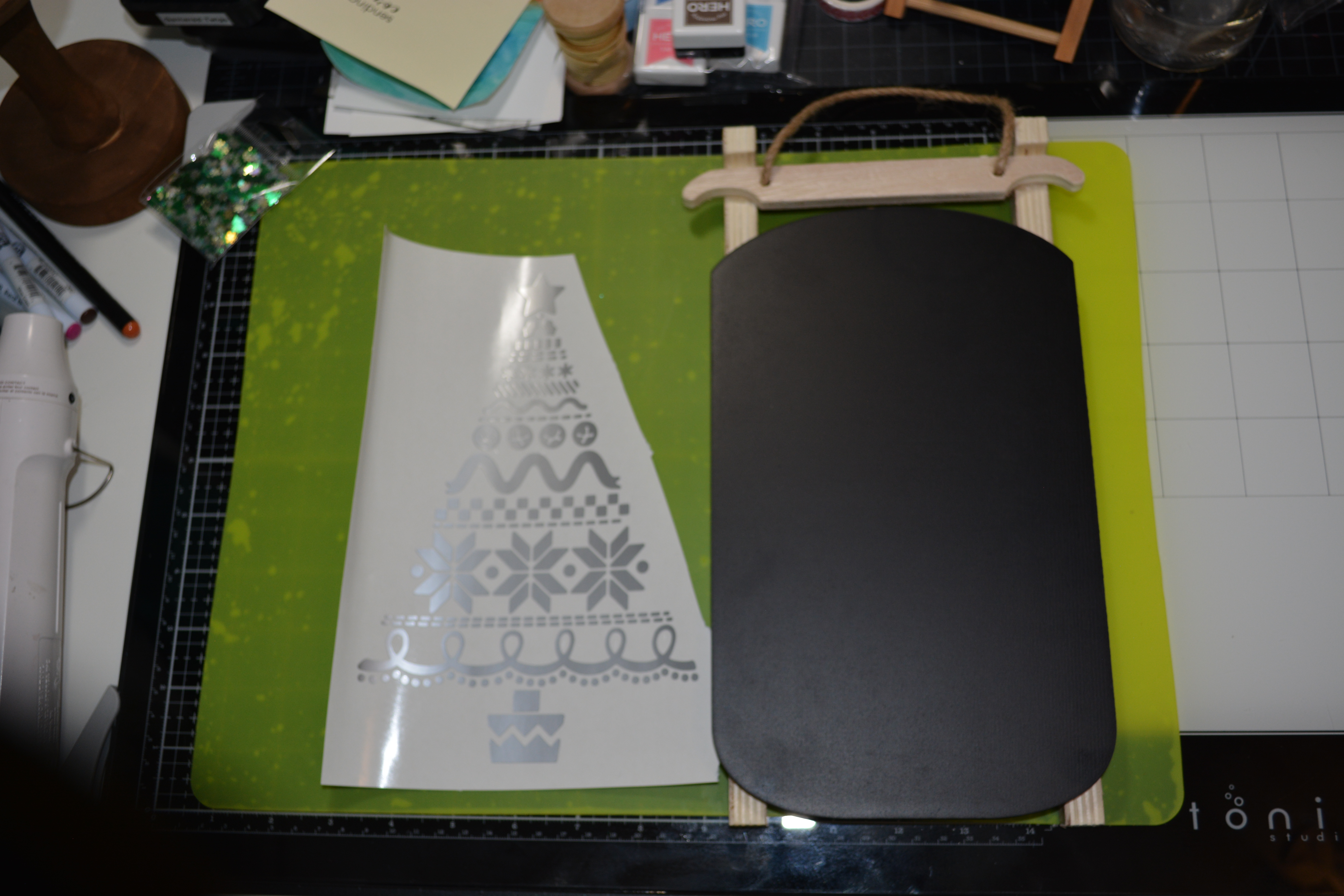 I got out my Cricut to start this project. You can use stickers, write or draw, or use stencils on the sled. I used the same method as above with the contact paper to get the vinyl tree onto my sled.