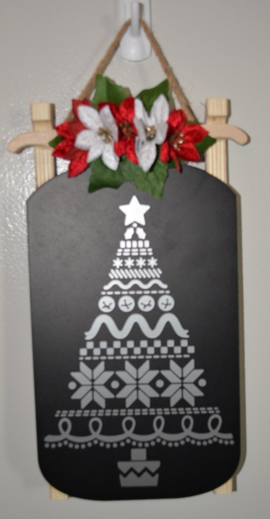 This next project was done with a sled I got at Target Bullseye Playground and flowers from Dollar Tree. None of the decals from Target fit on the sled except the mistletoe one and I did not want to copy the picture on the packaging. So I used my Cricut to cut out the beautiful tree decal.