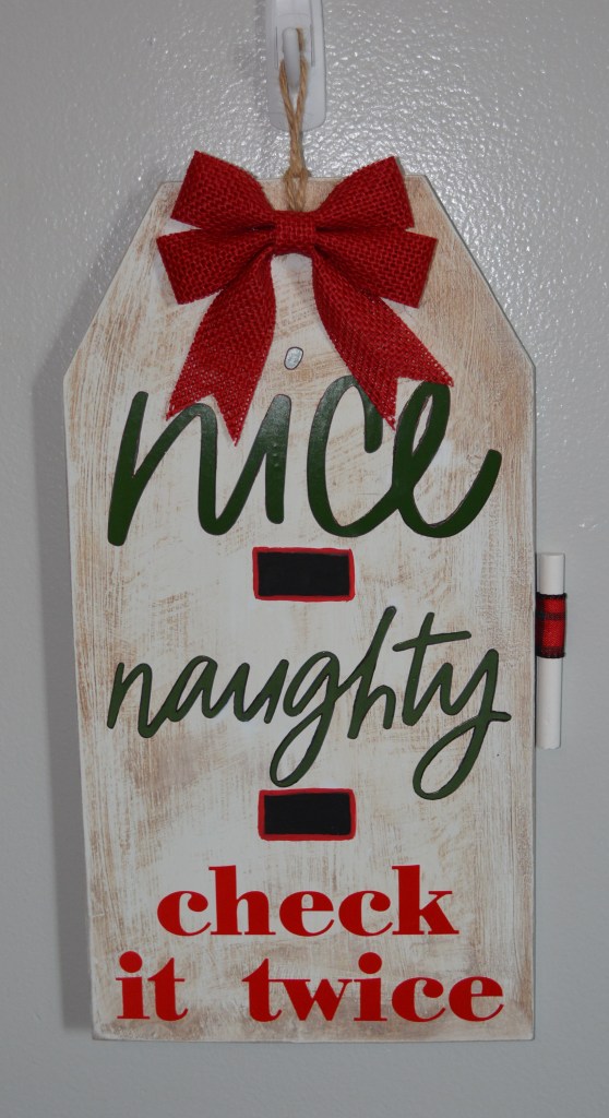 Here it is!! This is a complete transformation from the Dollar Tree tag I started off as. It would be fun to hang this on a kid’s room door to maybe keep them in line until Christmas comes. (I might be the only sassy one to do that) Your kids might have a lot of fun with this one.