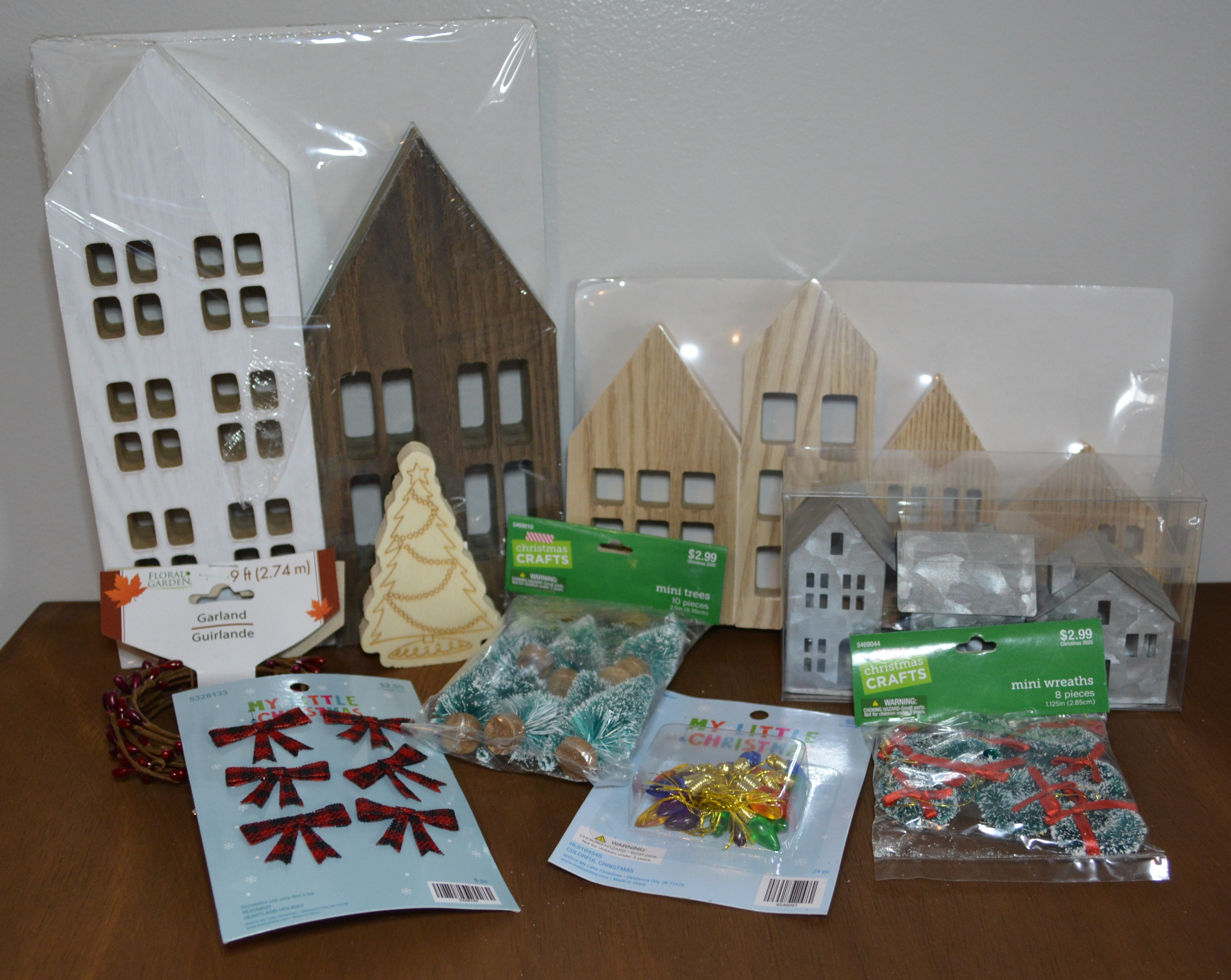 I am not going to lie, this project has a lot of pieces. To start, I got the Potions Halloween decoration at Target. You could make one of these out of foam core board from Dollar Tree. I used elf legs from Walmart. Some of the little stuff I used was felt, floral wire, fairy lights, houses, popsicle sticks, dowel rods, buttons, garland ties, fabric and a ceramic tree. The tools I used were wire cutters, hot glue, tape, and paint.
