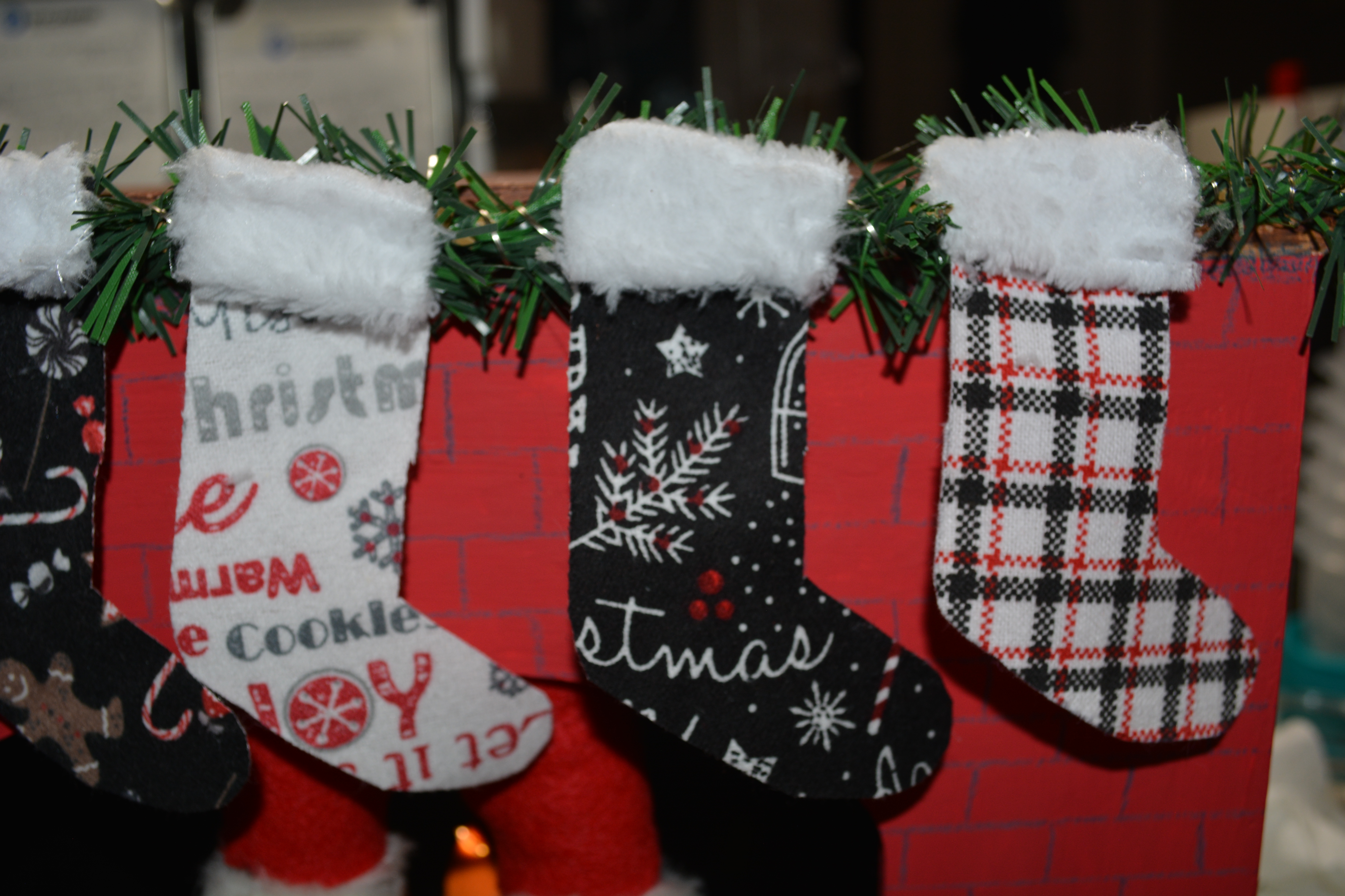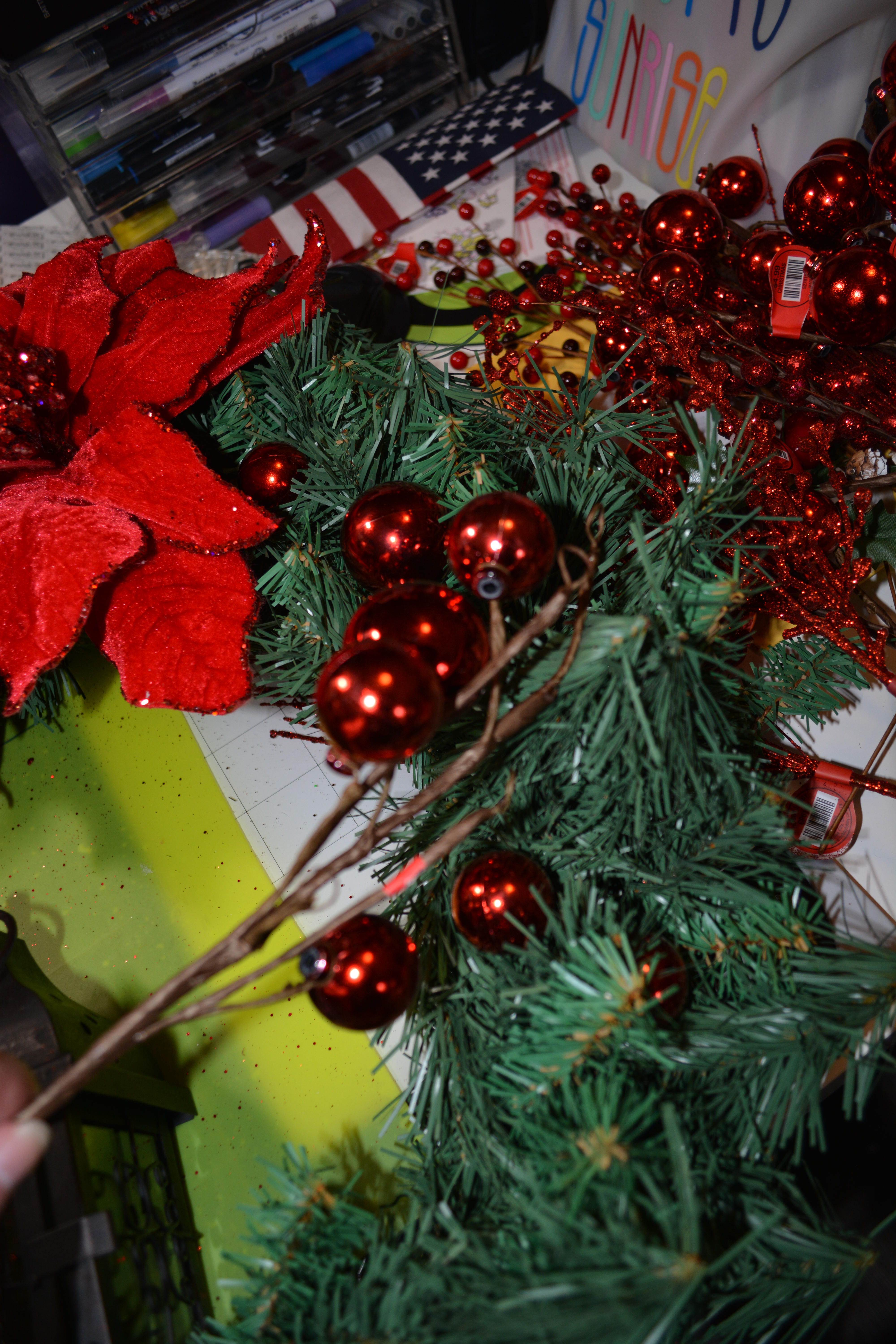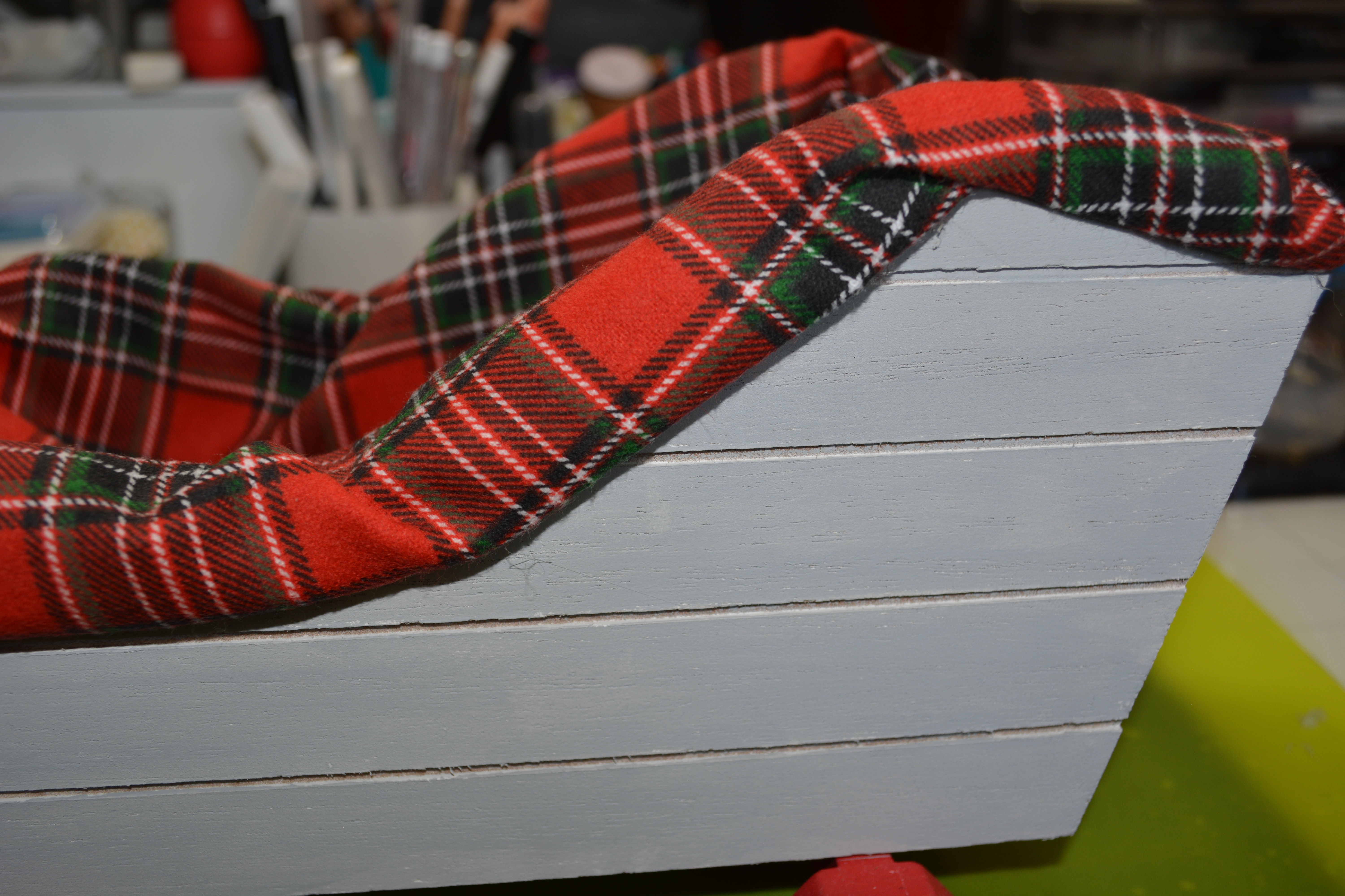 Around the top of the mantle, I hot glued 2 garland ties that I twisted together. From there I glued the stocking to it.