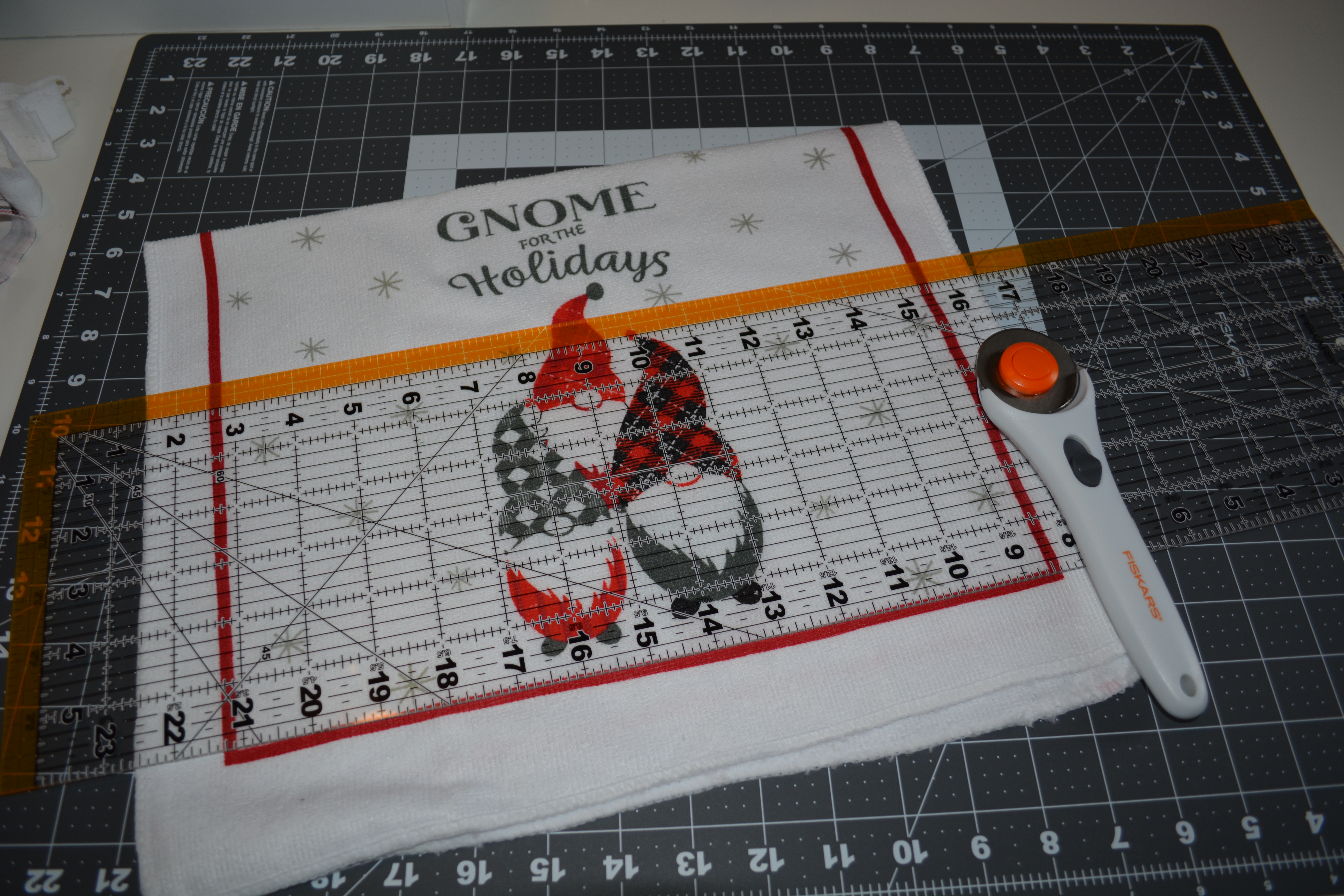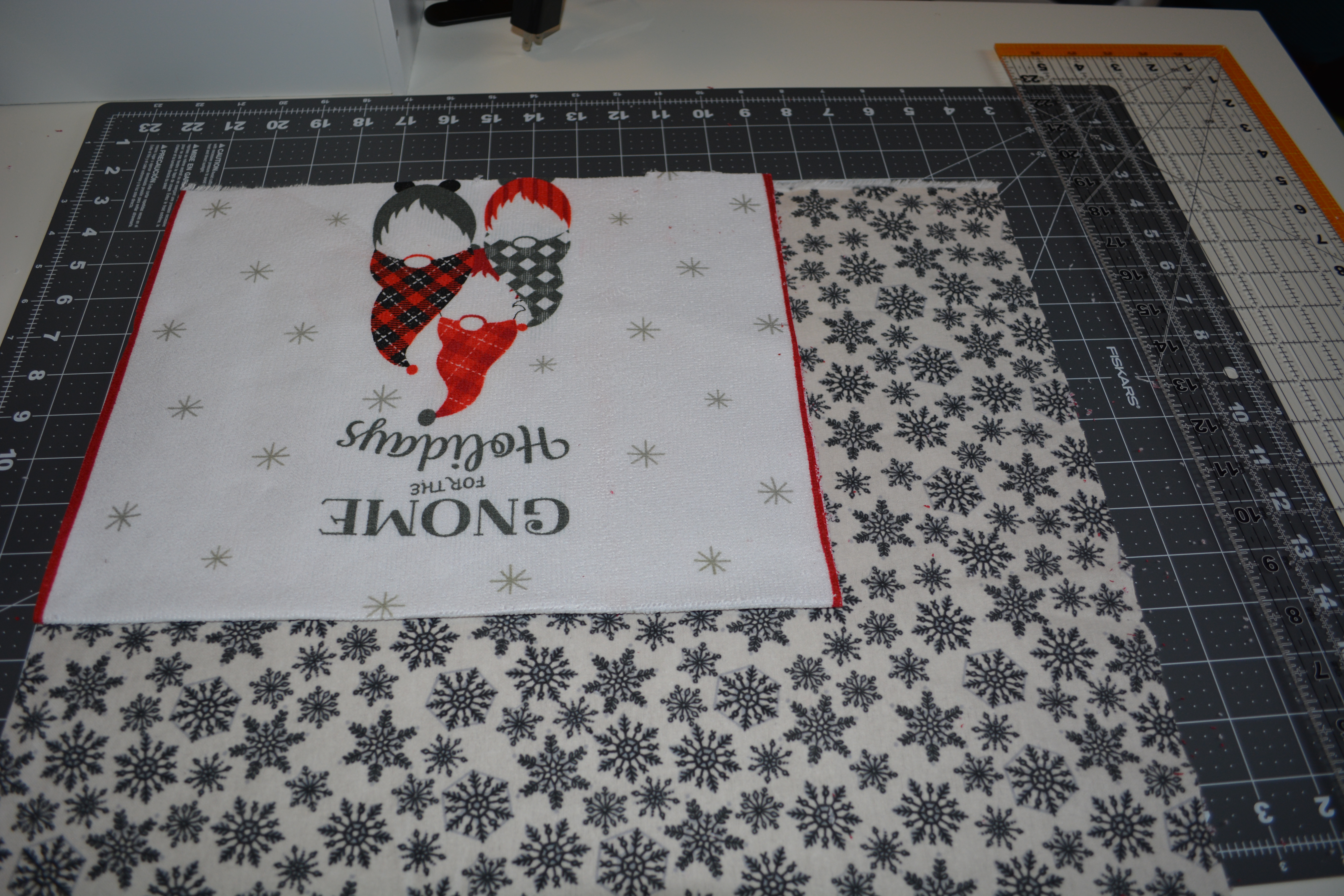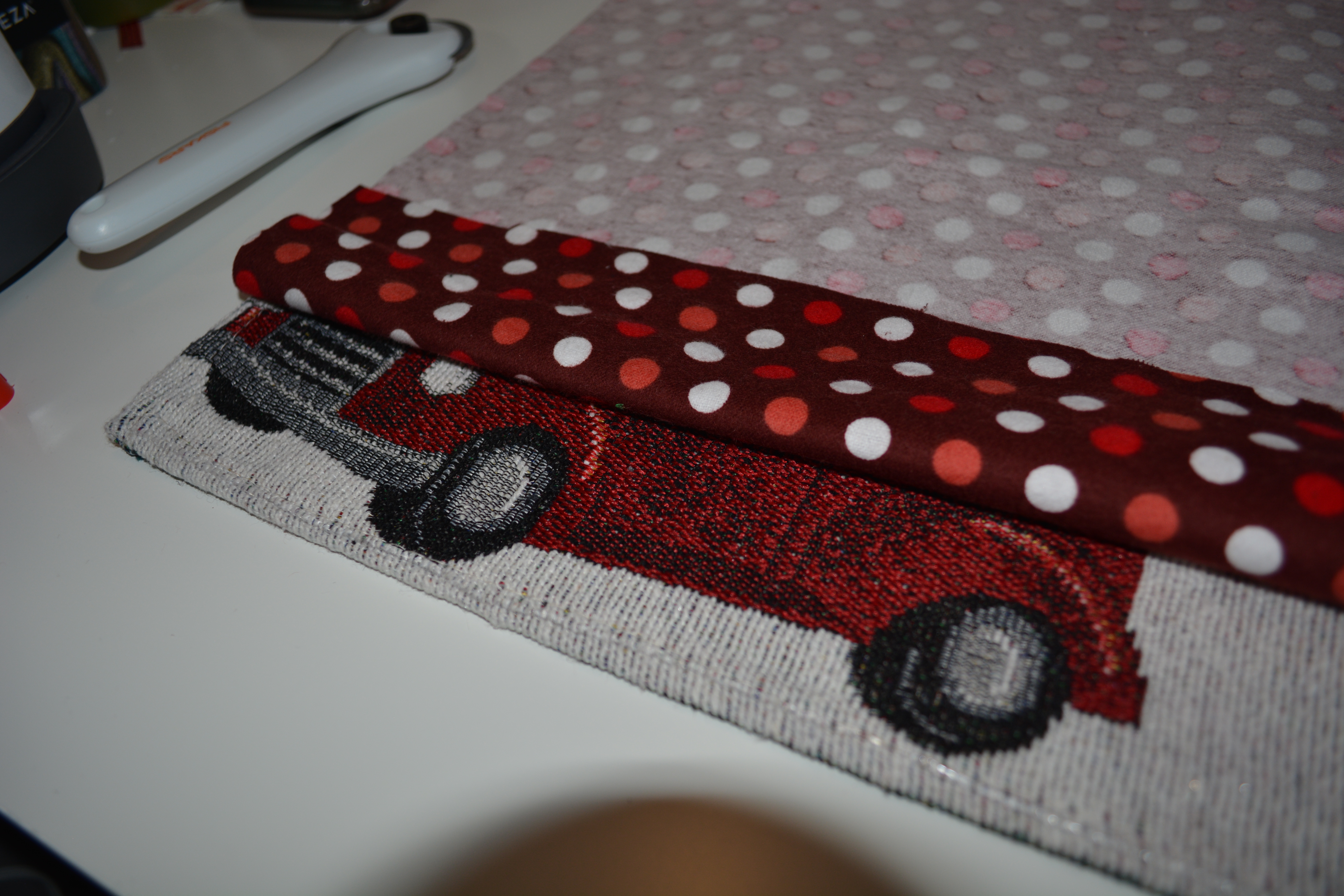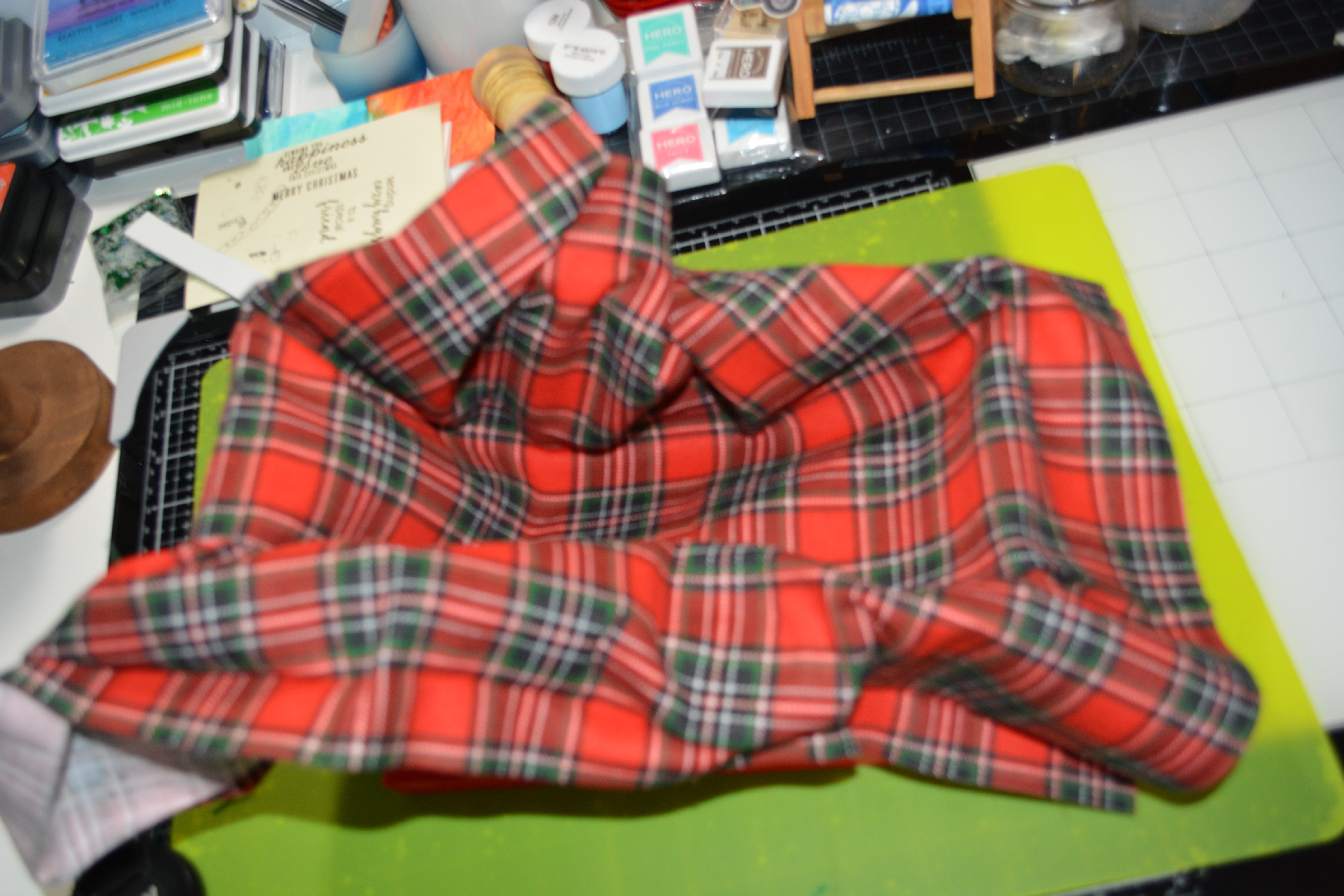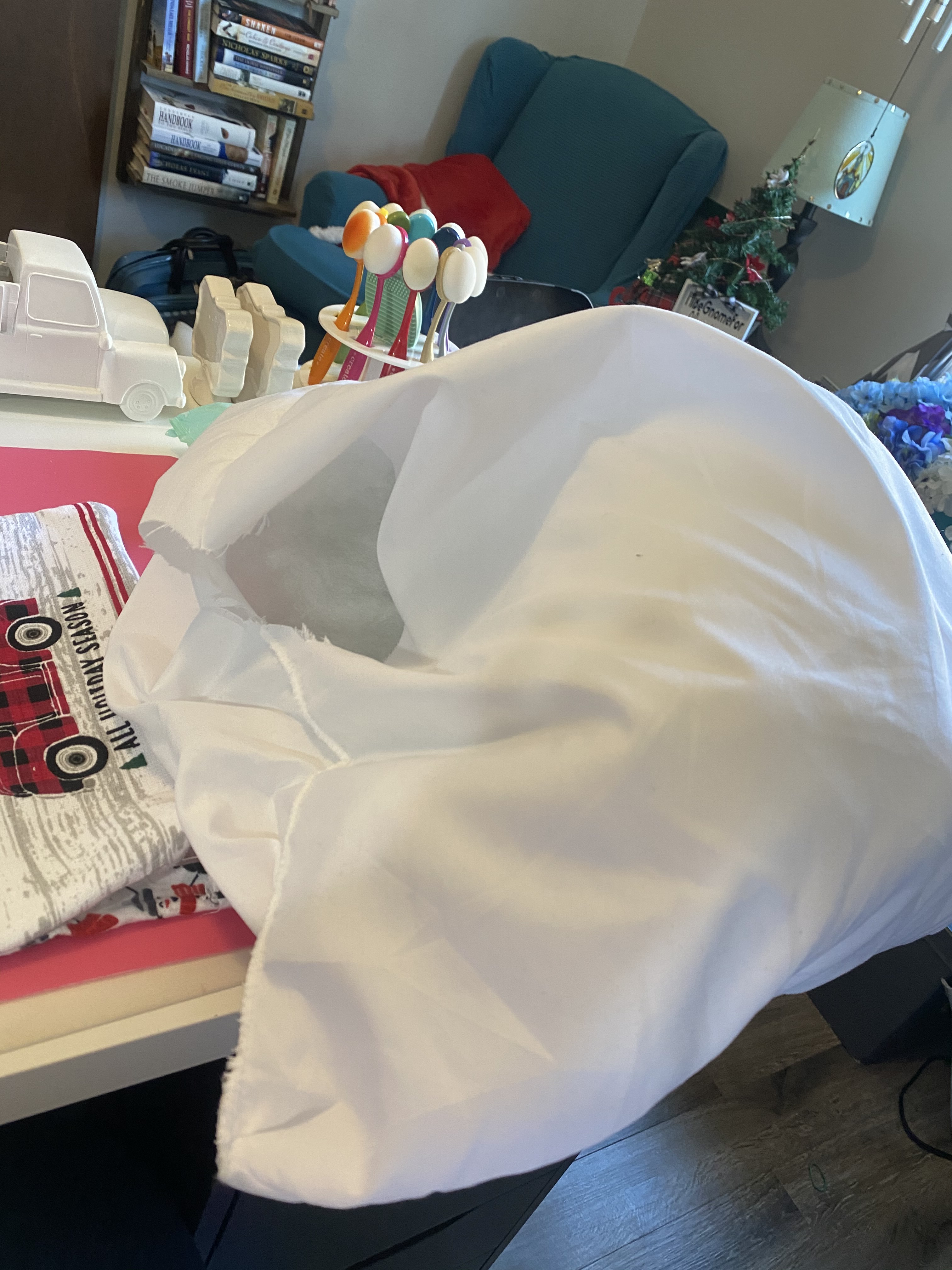 Now lets look at the stockings. I drew a stocking shape on fabric from Walmart. Lets be honest here I cut out a stocking 4 or 5 different times until I liked the shape and size of one. Then I used that one and cute out 4 more stockings. That gave me 5 all together and they were all different patterns. For the fluffy white trim, I used a white cloth from Dollar Tree. I cut it to size and rounded the corners. Then hot glued it onto the top part of the stocking.