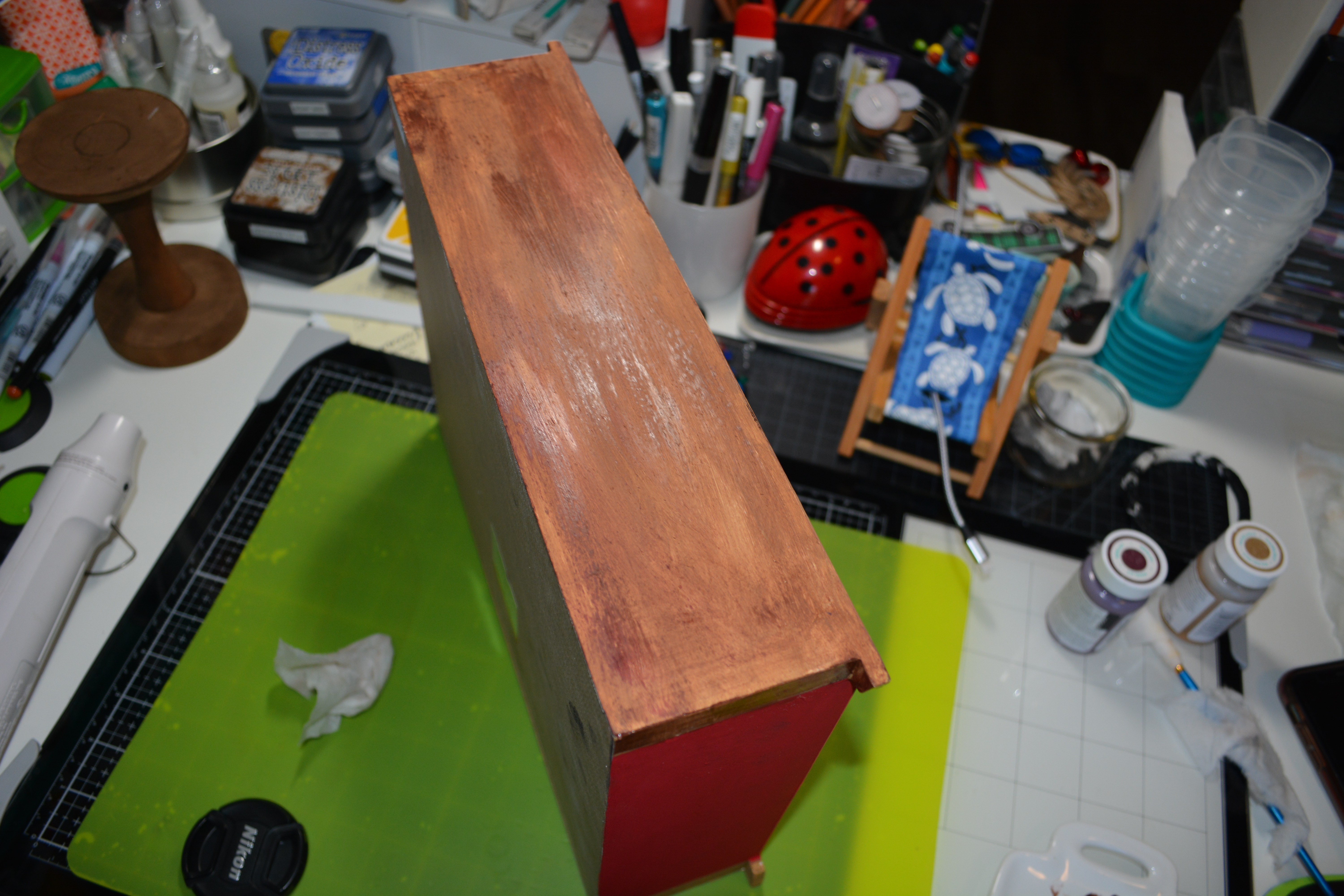 After the red chalk paint is dry, I took Waverly Chalk Paint in Hazelnut and painted the bottom and the top mantle with it. I let that dry just a bit and then dry brushed Waverly Antique Wax. This made the mantle and the bottom edge look like wood. I left the inside of the fire place black.