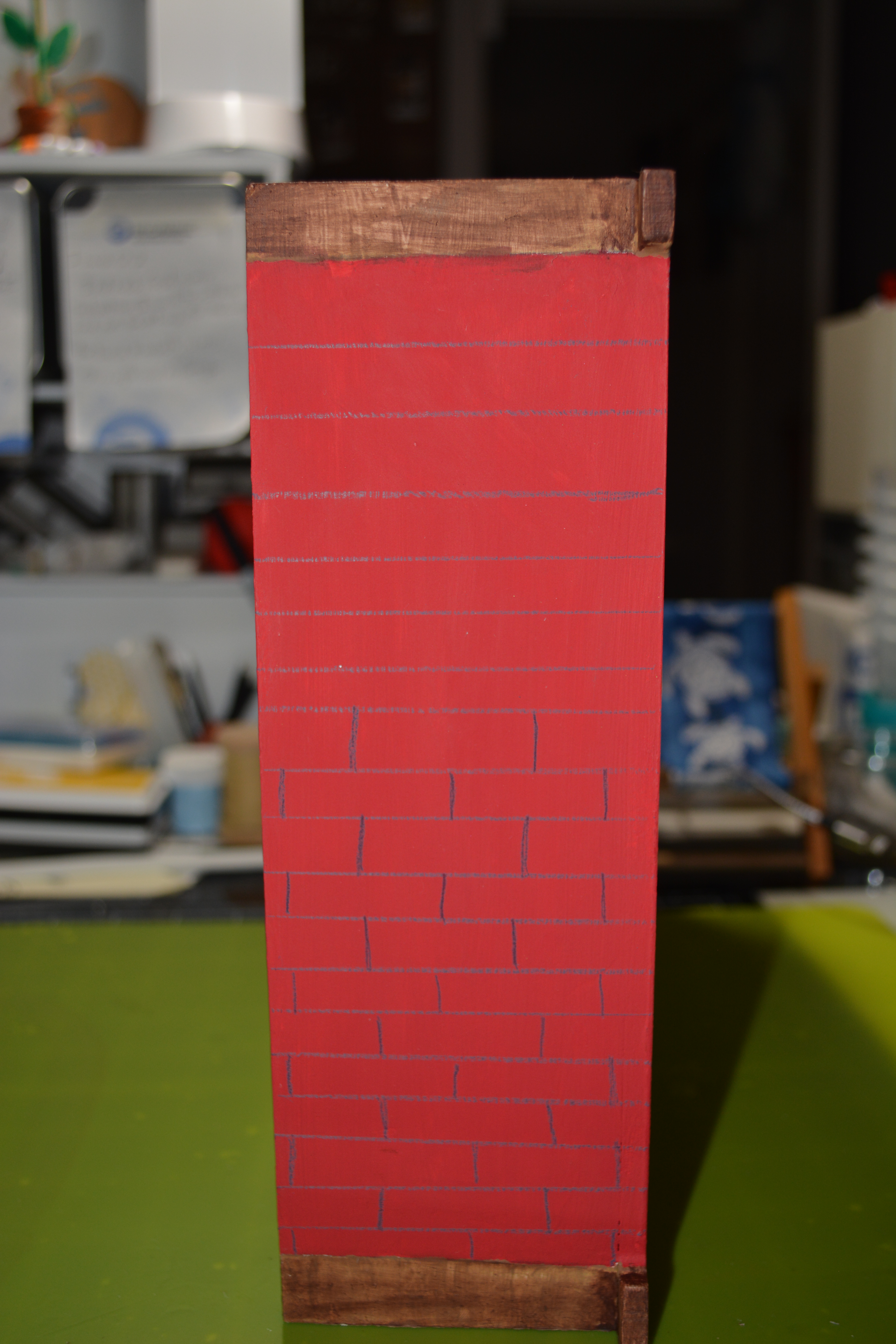 This next part is a bit tedious but the affect it gives is so great! I good a T-square and drew lines with a gray colored pencil to make the fireplace look like it was made out of brick. This took a bit and I started at the bottom of the fireplace and worked my way up.