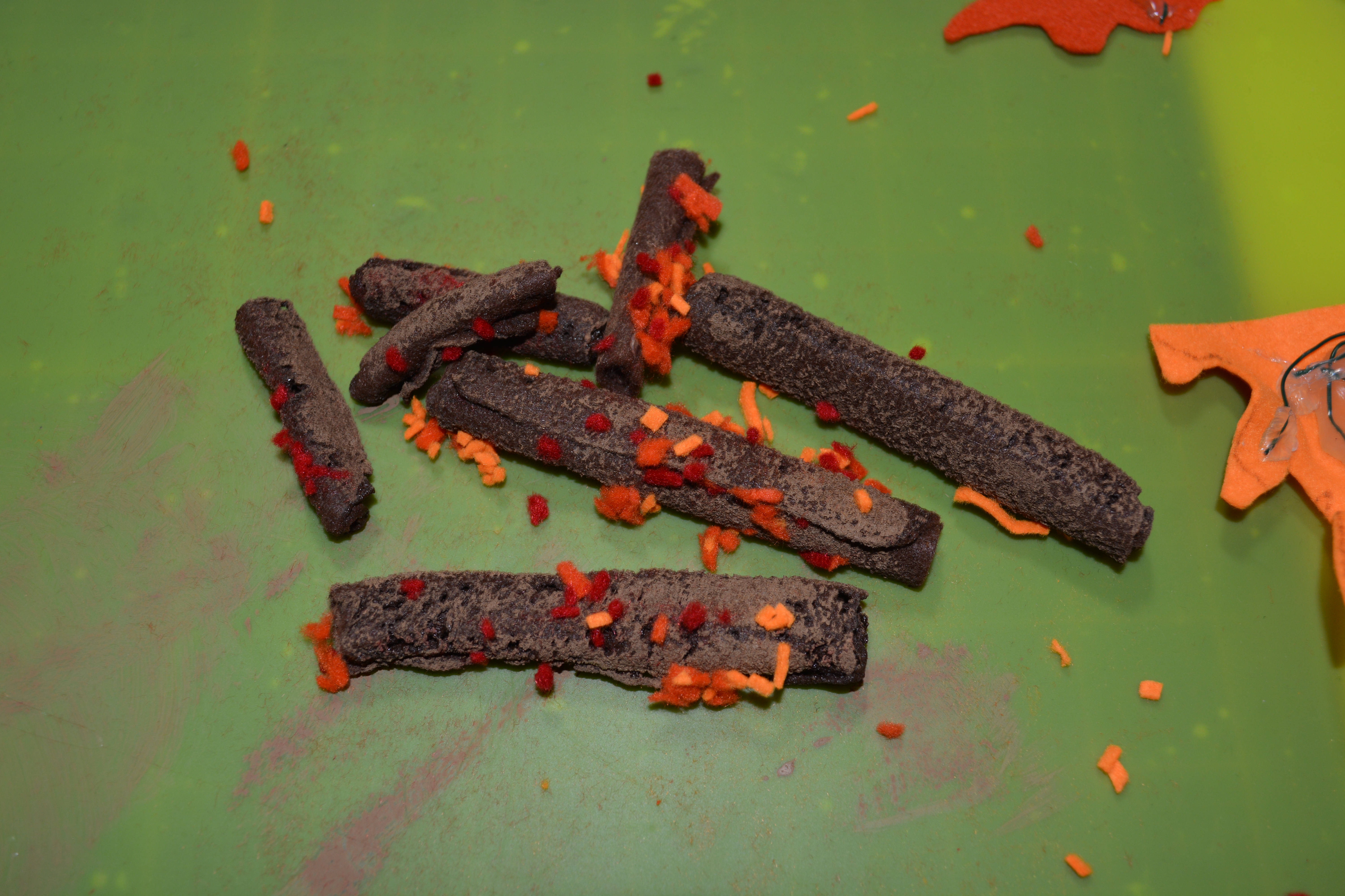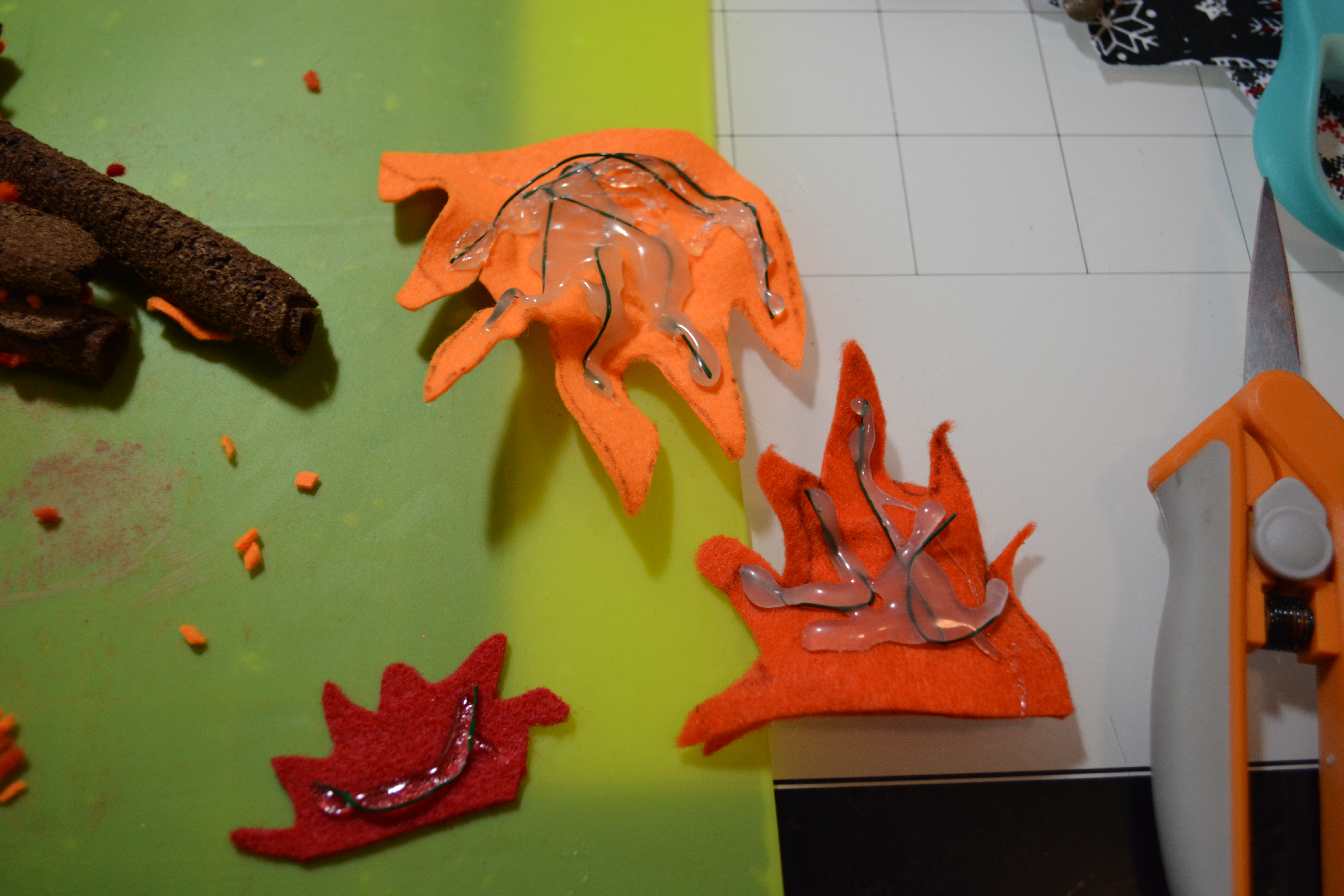 From there I cut very tiny pieces of the orange and red felt to add with the wood to make it look like it is burning,