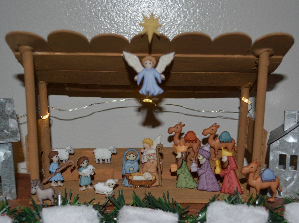 The last step was to add the manger scene. I wrapped some lights around it too. Any fairy lights that were in the back of the fireplace I taped them to the back so they could not slide around. It took 2 strands of fairy lights to light up everything in and on the fireplace.
