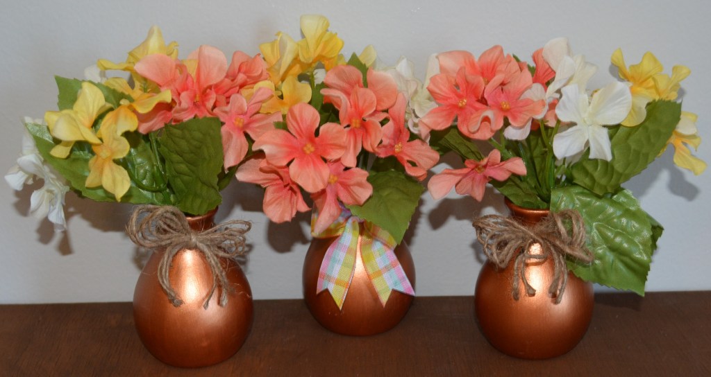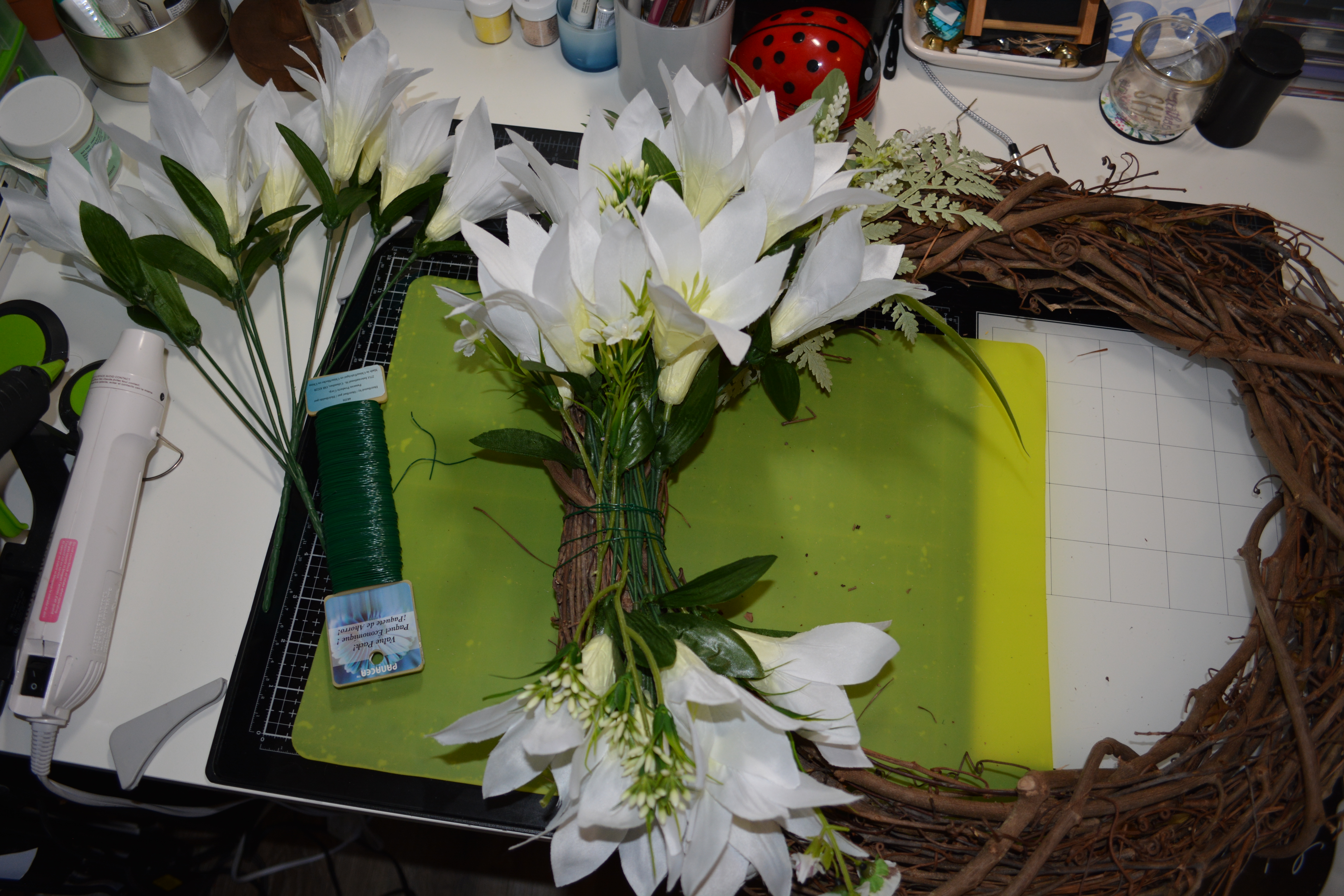 While your paint is drying start on the wreath and flowers. I used three bunches of Easter Lilies. Two up right and one pointing upside down. To attach them to the wreath form I used floral wire and wrapped it tightly around it. You can move and pull the flowers until you are happy with it. I used floral wire to attach the extra greenery too in places I felt needed it.
