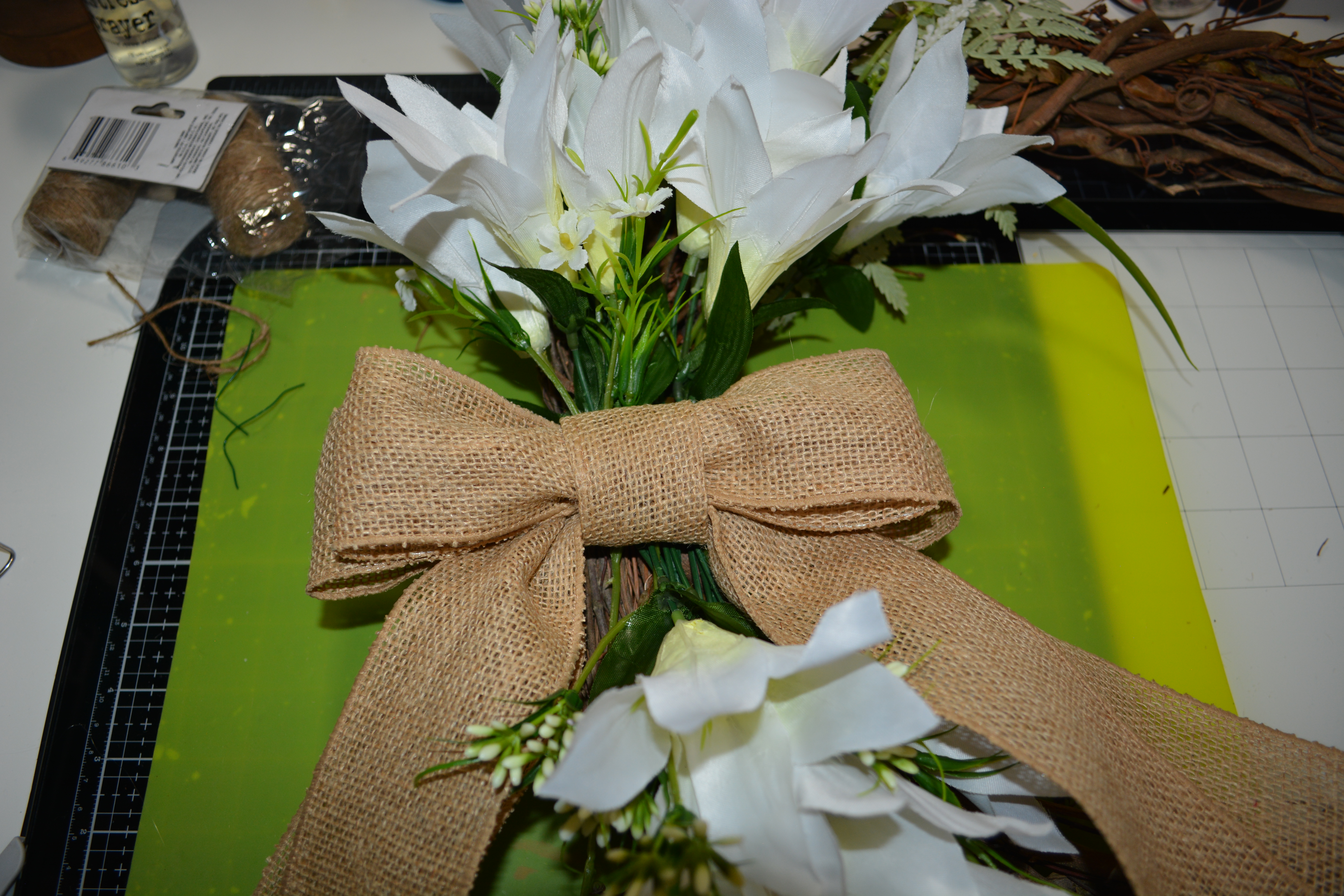 Next I took the burlap ribbon and made a big bow. There are several bow tutorials on YouTube and they are much better than me trying to explain it in words. I did add some floral wire to the back of the bow by threading it through the back loop and adding some E6000 to it to hold it in place and some hot glue for an instant hold. Then I placed the bow in the middle where the Lilies met and brought the wires around the back of the wreath form and twisted them together like you would with a bread twisty tie.