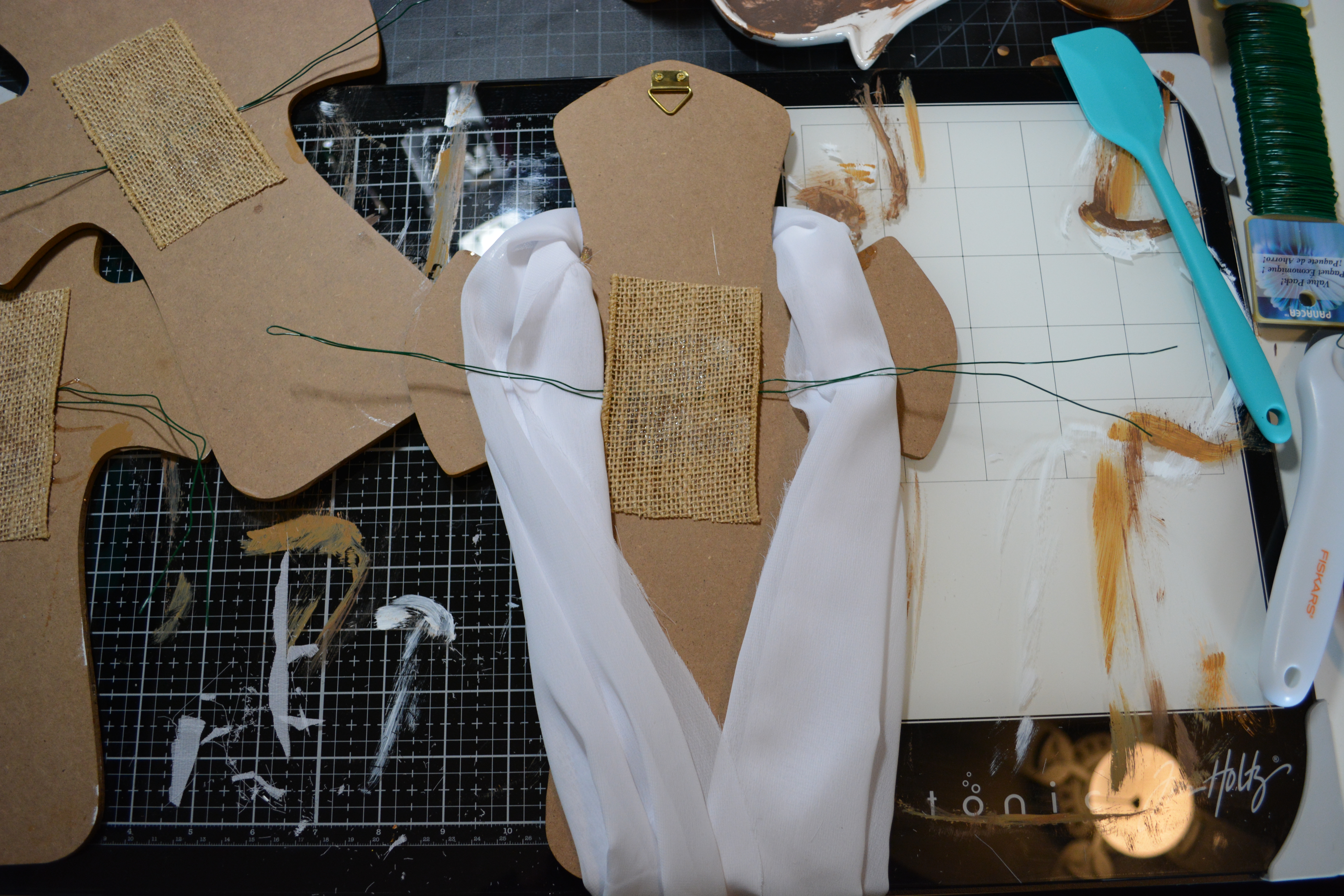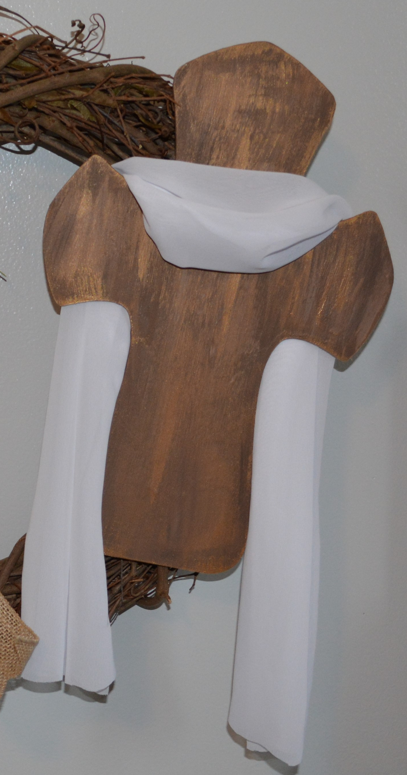 Its time to finish the cross. Cut the sheer white fabric to the length and width that you think looks best with your size cross and drape it around the cross. On the back of the cross, place some hot glue and E6000 behind the sheer white fabric to hold it in place. In the middle of the back of the cross, add the two glues to it then put a long piece of the floral wire in the glues. Take a strip of the burlap ribbon and place it over the wire sandwiching the wire between the ribbon and the cross. This will help hold the wire on. Finally add the cross to the wreath and wrap the wire around the back and twist it tight to hold the cross on.